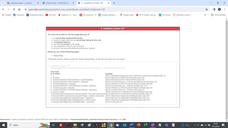 Hei. Päivitin viimeisimpään versioon ja sen jälkeen etusivu latautui, mutta kun yrittää valita menusta sivun niin tulee oheisessa kuvassa näkyvä virheilmoitus (eikä sivu lataudu). Ilmeisesti joku Extention ei ole 3.10 yhteensopiva, mutta en itse amatöörinä saa tuosta selvää että mikä. Minulla on myös toinen sivusto ja se toimii virheettömästi päivityksen jälkeen (sivu template on eri).