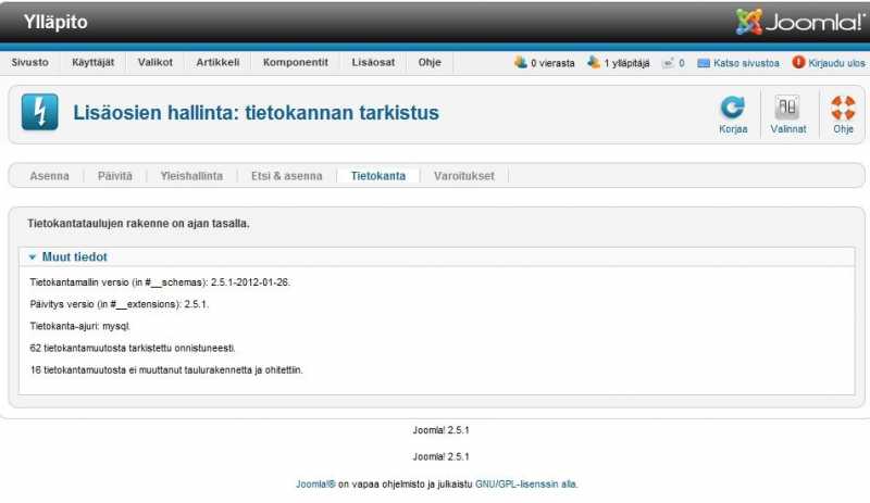 Joomla alunperin 1.5.20 ja migraatio 1.6-> 1.7 -> 1.7.5->2.5.0->2.5.1