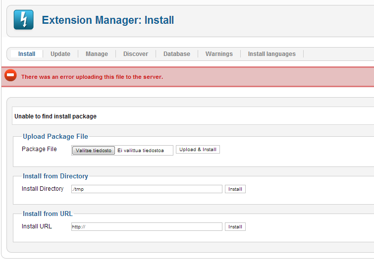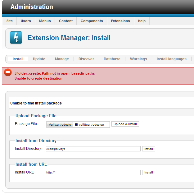 Kun kirjoitan asennuspaketin osoiteen joomla.org-palvelimella Install from URL -kohtaan, niin saan virheilmoitukset.