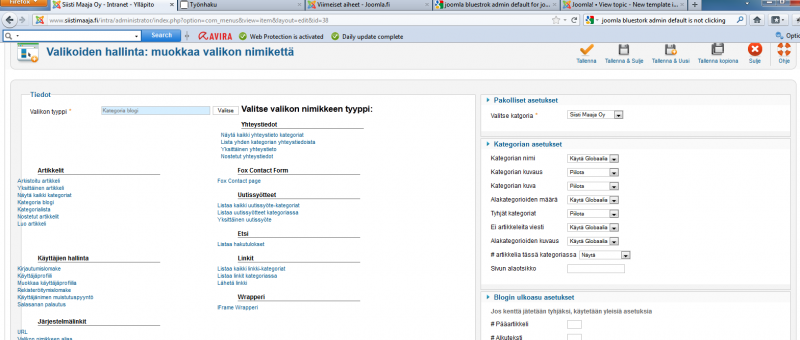 Päivitin Joomlan 1.5 jupgradella versioon 1.7. Toimii ihan hyvin saitin puolella, mutta admin puolella admin template hajosi. Uuden admin templaten lataaminen ei auta. Kuvaus liitteessä. Pohdin ongelmaa. Miksi en voi klikkaamalla valita artikkelia, lisätä linkkiin sene elementtiä (mitä linkki tekee), valita positionia eli asemointia moduulille...?