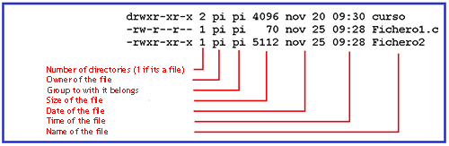 Yläpuolisesta kuvasta näemme, että tiedoston nimen (name of the file), luomisajankohdan (date of the file & time of the file), määrittelyn hakemistoksi (jos pätee, number of directories (1 if it’s a file)), sekä haltijan nimen (owner of the file) näytetään myös, mihin ryhmään se kuuluu (group to which it belongs).