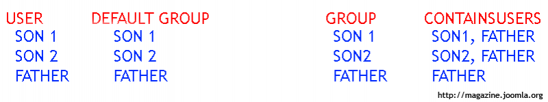 Mihin viitataan ”ryhmällä, johon se kuuluu”? Kaikki käyttäjät kuuluvat vähintään omaan ryhmäänsä. Kun käyttäjä luodaan, luodaan samanaikaisesti samalla nimellä ryhmä tuolle käyttäjälle. Näin jos vanhemmalle halutaan saada oikeudet käyttää molempien lastensa tiedostoja, ilman että he saavat oikeudet toistensa tiedostoihin tai vanhempansa tiedostoihin, on ensimmäiseksi lisättävä vanhempi käyttäjänä molempien lasten ryhmiin.