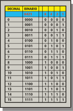 Sinisessä osassa kuvaa näkyy ”paino (weight)”, joka vastaa binäärin numeroarvoa desimaalina. Ensimmäisessä sarakkeessa vasemmalla oleva numero on desimaali, toisessa sarakkeessa numero on binäärinä, ja toisessa numero on myös binäärinä, mutta ositettuna niin, että se voidaan lisätä helpommin.