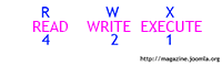 Käyttöoikeuksia EI IKINÄ aseteta muotoon ”777” tai ”666”, koska milloinkaan ei tule sallia muiden kuin haltijan muokata tai ajaa tiedostoja ellei se ole aivan pakollista. Joomlassa näin EI KOSKAAN käy.