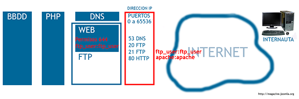 Kun Joomlan tarvitsee ladata tiedostotyyppi, joka ei ole http:llä, se yhdistää ftp-palvelimen lisätäkseen sen koneen kiintolevylle, jolla verkkopalvelimen tiedot (normaalisti) ovat, käyttäen käyttäjänimeä ja salasanaa joka sille on annettu. Näin verkkotiedostomme ovat käyttäjän ”ftp_user” hallinnassa, joka kuuluu ryhmään ”ftp_user”, ja joita ei voida koskaan muokata ryhmän ”apache” käyttäjän ”apache” toimesta.