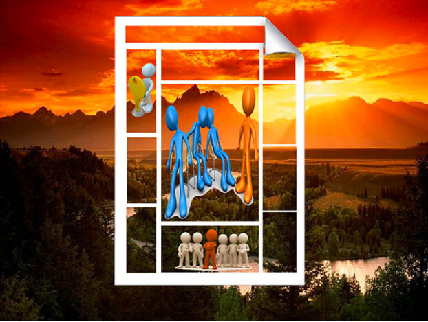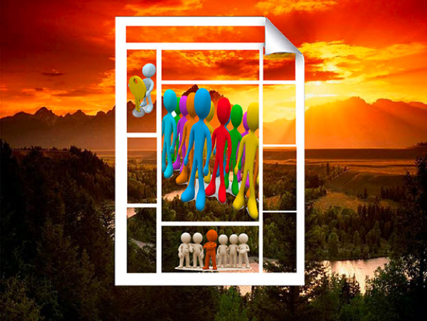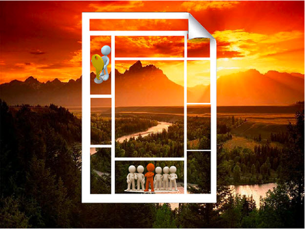 Etpä tietenkään! Nähdäkseen jotakin, tulee sivupohjan koodaajan (sivupohjansuunnittelijan) tehdä aukkoja kohtiin, joista haluttu tieto näkyy, kuten asiakas on halunnut. Oma paikkansa löytyy otsikolle, toinen tärkeälle tiedolle, yksi rekisteröityjen asiakkaiden sisäänpääsylle, ja vielä yksi näyttämään yleisempää tietoa. Tarvitaan siis melkoinen joukko aukkoja paperiin. Nyt näemme paperin aukkojen läpi:
