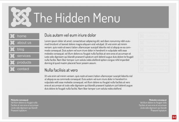 Tämä on yksinkertainen temppu, joka mahdollistaa yhden tai useamman moduulin näkymään määrätyissä sijainneissaan ja mahdollistaa niiden muokkaamisen samalla tavalla, kuin sivustosi tavallisten artikkelien muokkaamisen, lisäämällä Valikon nimikkeen piilovalikon sisälle. Sitä kutsutaan piilovalikoksi tai näkymättömäksi valikoksi koska se on julkaistu moduulin sijaintiin, jota ei ole näkyvillä missään sivuston julkisivussa. Tätä tekniikkaa käytetään myös ohjattaessa liikennettä jollekin tietylle sivulle.