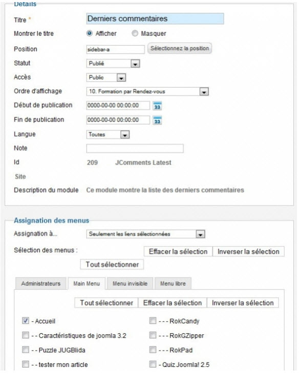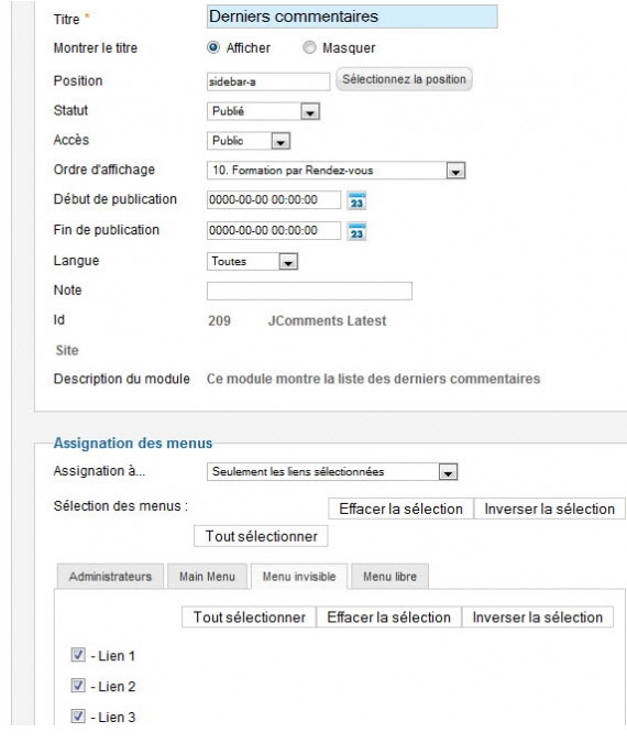 Määritä moduulit kolmelle artikkelillemme muokkaamalla valikon nimikkeitä ”Link1, Link2, Link3” Näkymätön valikko- valikon alta, kiinnittäen huomiota moduulien näkyvyyteen kullakin valikon nimikkeellä. Tehtyämme tämän, näkyvät halutut moduulit osana sisältöä riippumatta siitä, miten artikkeli linkataan. Prosessoidessaan artikkelin linkkiä Joomla pyrkii löytämään valikon nimikkeen, joka viittaa kyseiseen artikkeliin, mistä tahansa valikosta, mutta jos sitä ei löydy, käytetään valikon nimikettä määräämään miten moduulit näkyvät. Ei valikon nimikettä, ei moduuleja.