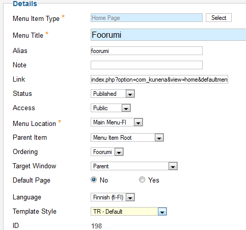 Kunena menu details:
