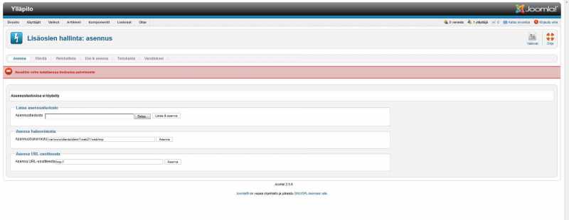 Ja yritän siis ladata VirtueMart 2.0.2 versiota, mutta jostain syystä tulee vain virheilmoitus: "JInstaller: :Install: XML-asennustiedostoa ei löydetty"