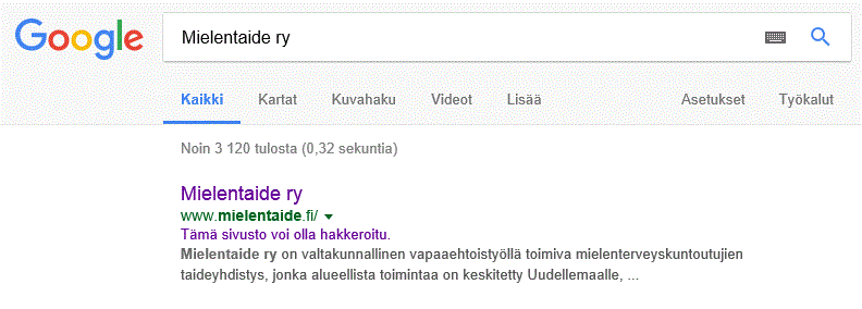 Ylläpidän Mielentaide ry sivustoa (jossa pyörii viimeisin joomla alustana). Samalla hotellipaketilla olleeseen toiseen sivustoon hakkeroitiin marraskuussa 2016 ja se asia on korjattu ja loppuun veisattu. Mielentaide ry sivuihin ei hakkerointi ylettynyt. Ongelmana on kuitenkin se, kun google hakee yhdistyksen nimellä, tulee hakutuloksen yhteyteen infoviesti: "Tämä sivusto voi olla hakkeroitu".