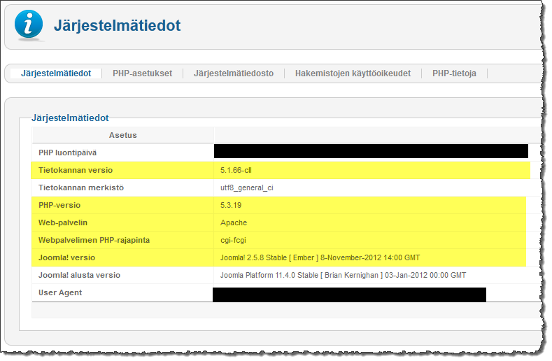 - Anna alla näkyvät tiedot kun kysyt ensi kerran (ne saat Joomlasi ylläpidosta Sivusto => Järjestelmätiedot. Useimmiten ne auttavat kummasti vastaajia.