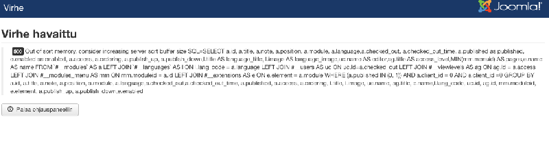 Moduulit-kohdassa tuli kuvan mukainen virheilmoitus ja laitoin asiasta meiliä palvelimen ylläpitäjälle. Eli sort buffer size -arvo oli ilmeisesti liian pieni.