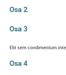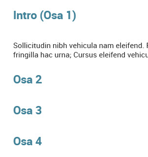 Kun avaan artikkelin tulee näkyviin Intro (osa1) ja muista otsikot. Kun napsautan esim. otsikkoa Osa 3, näkyviin tulee Osa 3 ja muista jää näkyviin otsikot (myös otsikko Intro (osa1) näkyy, jäi vain kuvasta 2 vahingossa pois). Jatkoin osa kerrallaan ja ainakin näin tuntui pelaavan. Ks. liitekuvat.