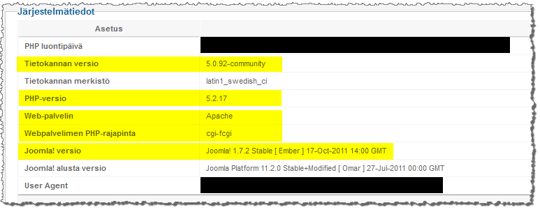 - Nämä tiedot löytyvät Joomlan ylläpitoliittymästä versiossa 1.7 kohdasta: Sivusto > Järjestelmätiedot ja versiossa 1.5 kohdasta Ohje > Järjestelmätiedot.