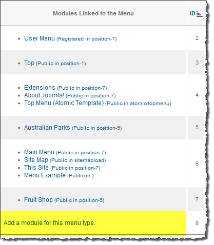 4. Helpompi tapa lisätä uusi valikko moduuliin. Valikon hallinnassa uuteen valikkoon tulee linkki (valikkojen listanäkymässä)suoraan moduulien hallintaan, jossa taas uusi ko. valikko on lisätty valikkomoduuliin. Ylläpitäjälle jää normaalit moduulin asetukset. Monesti uudelle Joomlan käyttäjälle on tuottanut hankaluuksia tämä "matemaattinen" kaava: valikko + moduuli = sivustolla näkyvä valikko.