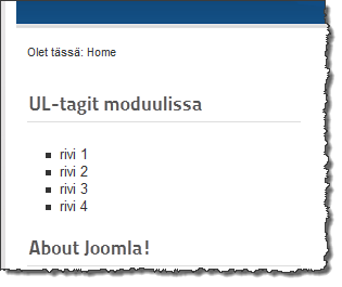 Kyllä ul-tagit toimivat Oma HTML -moduulissa normaalilla tavalla. Alla kuvassa esimerkkinä JCE-editorilla tehtynä. Etutunnisteeksi valitsin neliön. Eli vastaus: JCE-editori helpottaa elämääsi monessa kohtaa.