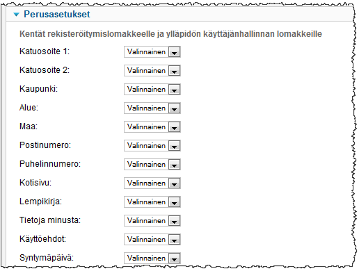 Joomlassa saat lisää kenttiä käyttöön rekisteröitymislomakkeeseen kun otat käyttöön liitännäisten hallinassa Käyttäjä - profiili -nimisen liitännäisen ja määrittelet siinä mitä lisätietoja on annettava rekisteröitymisen yhteydessä pakollisena tai valinnaisena ks. kuva.