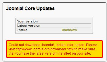 Error viestinä: "Could not download Joomla! update information. Please visit www.joomla.org/download.html to make sure that you have the latest version installed on your site.