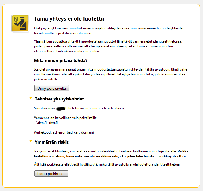 Laitan liitteeksi tietoturvavarmenneilmoituksen, joka tuli kirjautumista kokeillessani. Vaikuttaako tämä asiaan. Tietoturvavarmenne on eri domainille, mikä meillä on. Domain on webhotellin tarjoajan domain-tunnus.