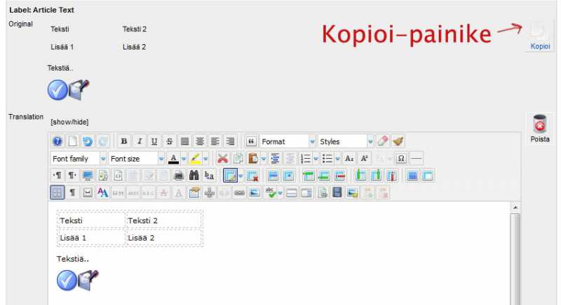 Toisin sanoen esim. JoomFishin tarjoama 'Kopioi' painike artikkelien/modulien yhteydessä toimii normaalisti.