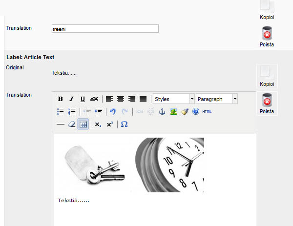 Kopioidessasi siis alkuperäisen tekstin kuvineen ja taulukoineen JoomFishissä saat siitä 1:1 kopion artikkelien käännöskohtaan.