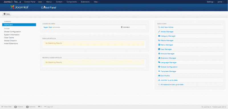 Tämä sanottuna, niin Joomla 3 vaikuttaa oikein hyvältä uudistukselta. Suurimmat uudistukset tuntuvat alkuun olevan tuolla käyttöliittymäpuolella, joka on nyt täysin "mobiili" yhteensopiva ja käyttää Twitterin Bootstrappiä .