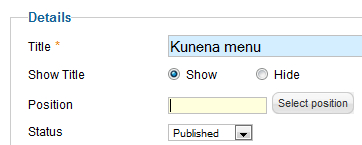 Muistaakseni en aikaisemmin ole moduulissa valinnut mitään paikkaa menulle vaan Kunena lisäsi valikon automaattisesti Kunenan yläosaan. Minulla siis ei ole mitään valittuna: