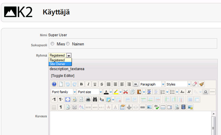 Komponentit - K2 - Käyttäjät ja avaa haluamasi tunnus. Laita sitten ryhmäksi "Site owner" ja pitäisi pelittää.
