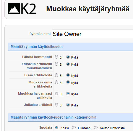 K2:n Super User käyttäjäryhmän kaikki käyttöoikeudet ovat kyllä -kohdassa enkä Joomlan omien käyttäjäryhmien käyttöoikeuksiinkaan ole koskenut.
