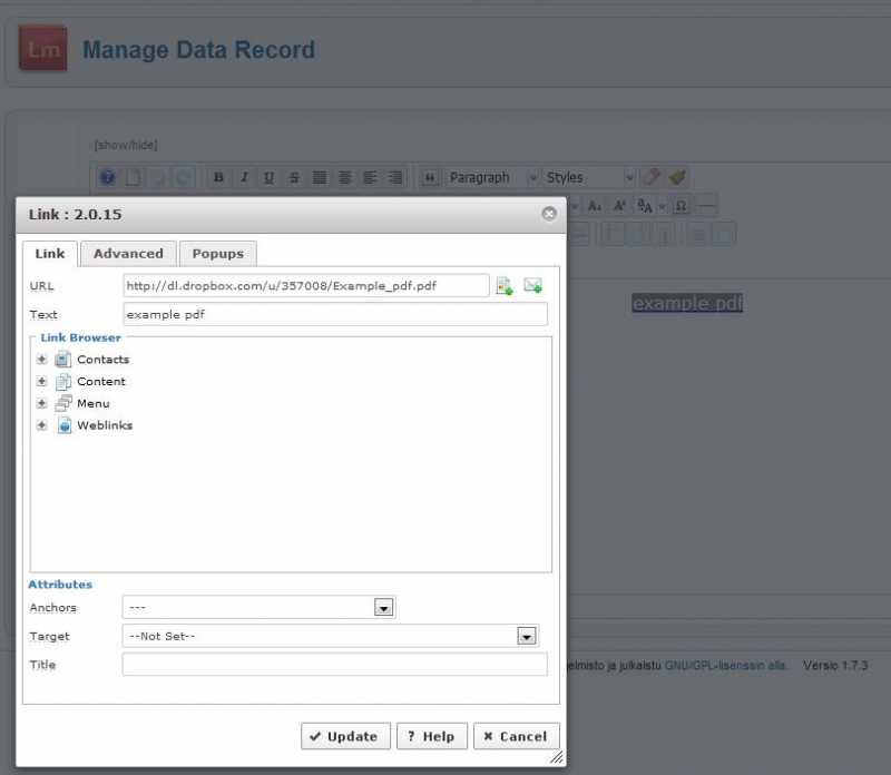 Hommasin Moonsoftin List Manager -komponentin, joka olisi minulle soveltuva, mutta yksi vika siinä ilmeni linkityksessä. Kun linkitän tiedostoja esim. Dropboxistani, niin tallennuksen jälkeen linkki menee ns. rikki. Kuvat kertonevat, mitä tarkoitan. Osaisiko joku sanoa onko tälle jokin selitys?