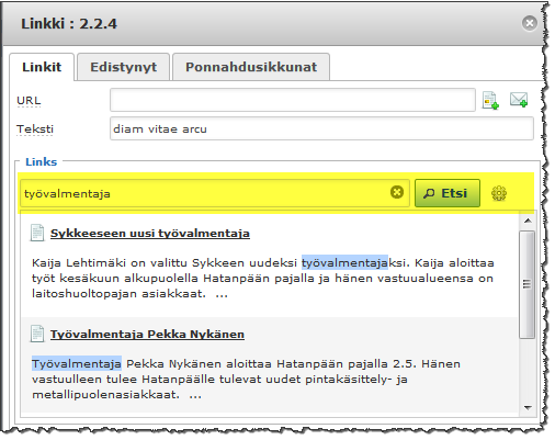 Linkkityökalun haussa voit hakea esimerkiksi artikkelia artikkelin sisällön perusteella. Hakunasana vain kenttään ja hae.