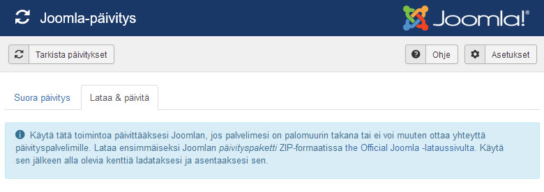 "Käytä tätä toimintoa päivittääksesi Joomlan, jos palvelimesi on palomuurin takana tai ei voi muuten ottaa yhteyttä päivityspalvelimille. Lataa ensimmäiseksi Joomlan päivityspaketti ZIP-formaatissa the Official Joomla -lataussivulta. Käytä sen jälkeen alla olevia kenttiä ladataksesi ja asentaaksesi sen."