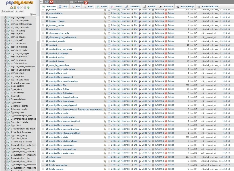 Sitten vaihdoin sen prefix-etuliitteen nimen configuration.php tiedostosta ja ajoin phpMyAdmin-ohjelmassa Prefix-nimien vaihdon J3_-tauluille.