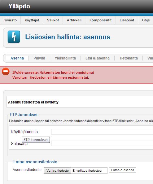 Kiitos! Kyllä noita ohjeita kannattaa näköjään noudattaa! Tuonkin muistin lukeneeni, mutta aattelin, ettei se kuitenkaan vaikuta. Vaikutti kuitenkin, päivitys löytyi! Kuitenkin tuli taas samantapainen virhe kuin Akeeban asennuksessa, mitä en saanut tehtyä. Olisko tuolla kirjoitussuojattu hakemistot tmv? Niitä olen jostain ohjeesta lukenut, mutten vielä tuolta tutkinut. Kuvissa selkiää.
